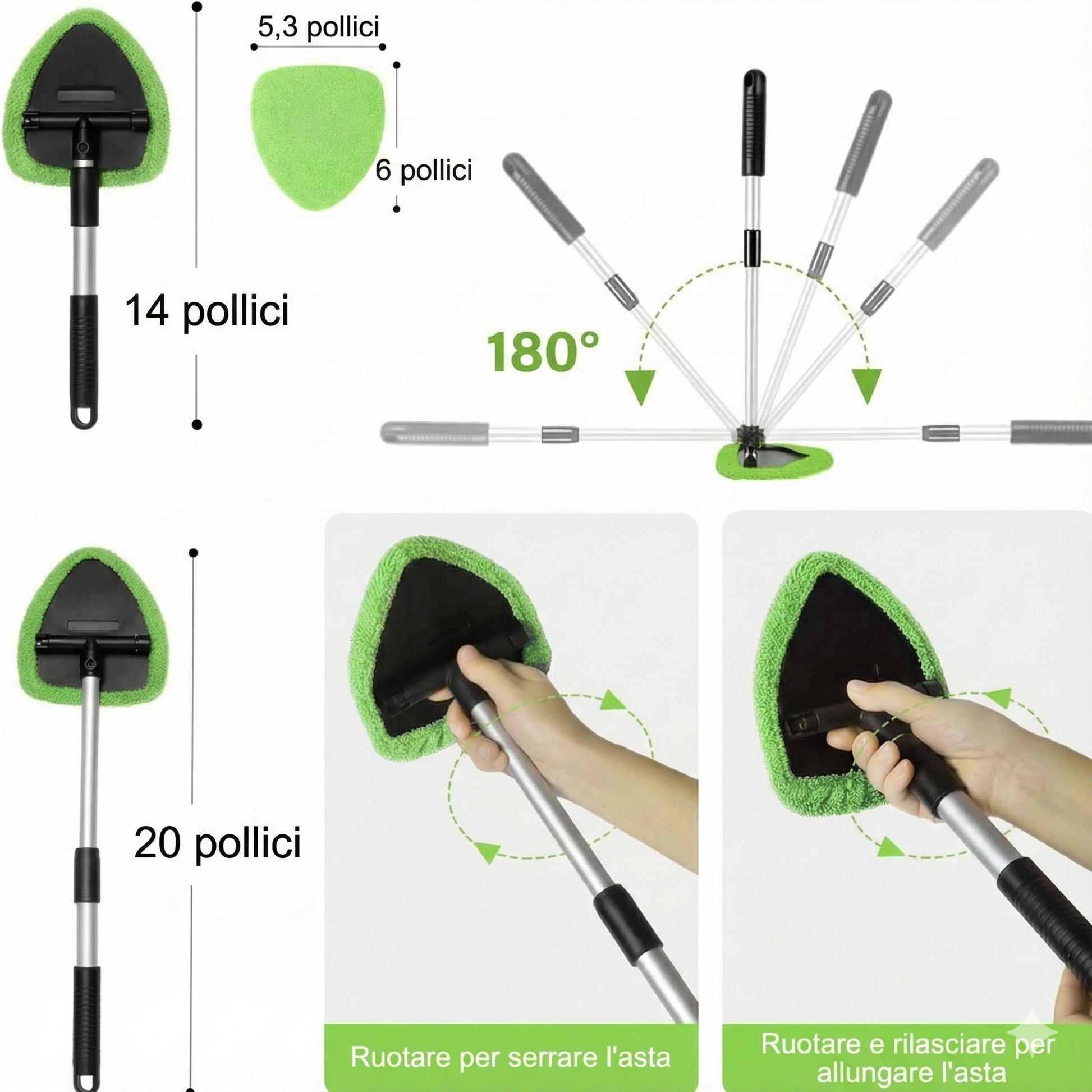 3 panni in microfibra: riutilizzabili e lavabili per molteplici utilizzi. · Asta verde + panni: ideale per una pulizia accurata. ·